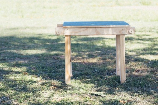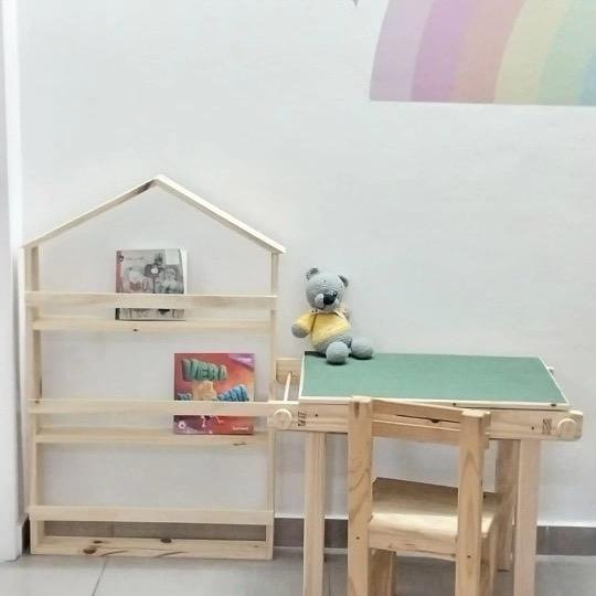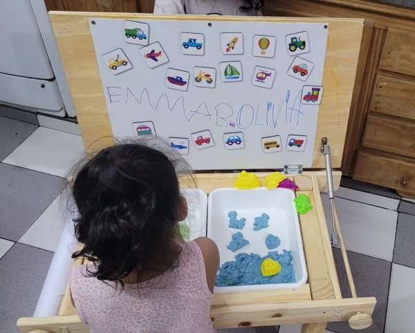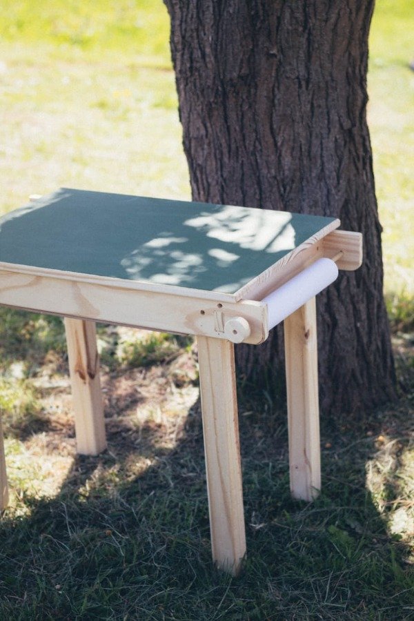 Mesita con pizarrón y porta rollo de papel, levanta su tapa y encontrás una pizarra imantada y 2 bateas para guardar y jugar.